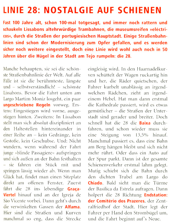 Eléctrico 28 | Altstadt | Die Eléctrico ist die traditionelle Straßenbahn Lissabons. Die Linie 28 fährt ausschließlich durch die Altstadtviertel der Stadt. Start am Rossio.Quelle: Wikipedia | ||||