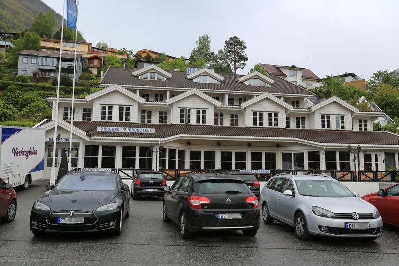 Am Supercharger (SuC) in Aurland habe ich nochmals Fotos gemacht, da der GPS Empfänger bei den letzten 50 Fotos von gestern wegen leerer Batterie im Streik war. Eine Fahrt durch den längsten Autotunnel der Welt, welcher hier beginnt, streichen wir. Es wären 24,5 km in die falsche Richtung und damit nochmals die Strecke zurück. Und das in einem dunklen Tunnel. Ist es uns nicht wert, zumal das Tagesziel – Hotel Pollfoss in Skjåk – ca. 500 km entfernt ist. Und es gibt noch sehr viele Tunnel in Norwegen.